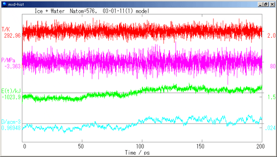 192個のH2O分子(= 384個のH原子 + 192個のO原子)からなる系を 20℃(=293 K)に保持したところ,内部エネルギーと密度の上昇が起きました. 少しずつ液体の水部分が拡大していき,やがて全体が融解したのです.
