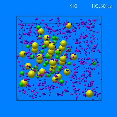 上の図から約200 ps 経過すると,固体NaClの立方体は崩れはじめます.