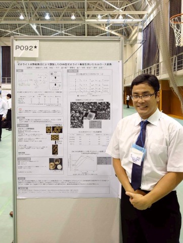 竹下さんは「様々なゼオライト触媒を用いたセルロースからフルフラール類への選択的変換」というタイトルで発表を行いました。セルロースは地球上で最も多い有機化合物であり,脱石油の持続型社会の実現に向けて化学原料や液体燃料になる芳香族化合物を製造する研究が世界中で行われています。竹下さんは,ある種のゼオライト触媒(H-FER型)を用いることにより従来より高収率で有用なフルフラール類を生成できることを示し,その特異な触媒作用が適切なナノ細孔サイズと適度な酸強度にあることを明らかにしました。