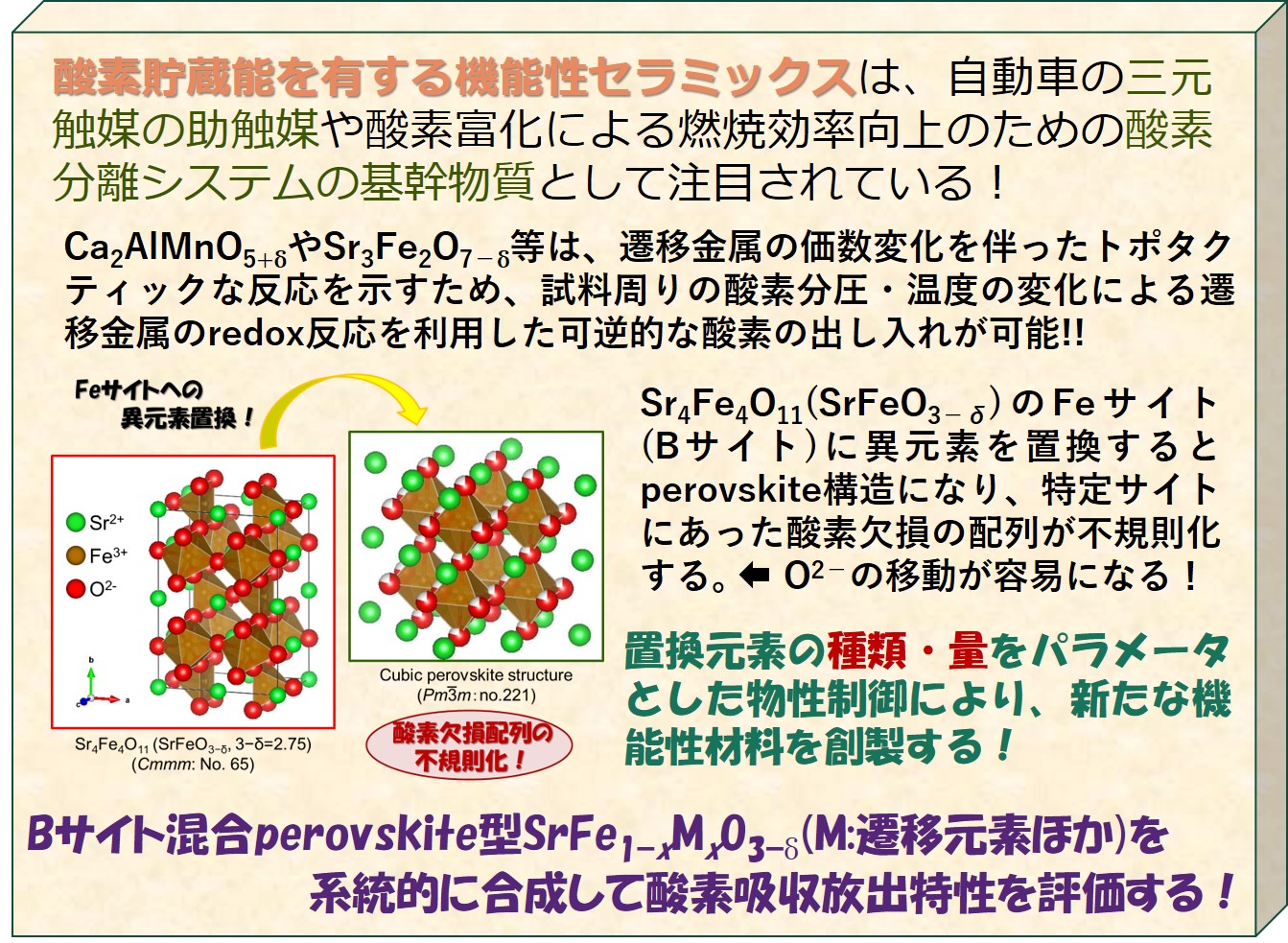 酸素貯蔵能物質は、気相中の酸素を自身の構造中に可逆的に出し入れできるため、自動車用三元触媒や酸素富化空気の生成の基幹物質として応用・検討されています。 この現象は物質中の遷移金属イオンが、周りの温度や酸素分圧の変化に対応してredox反応を示すために生じます。 この研究では、SrFeO3−dのFeサイトに他の遷移元素を置換すると、その種類や量といったパラメータによって酸素欠損の配列や量、 化学的な安定性が変化することに着目し、それらパラメータと酸素吸収放出特性の相関関係を調査しています。