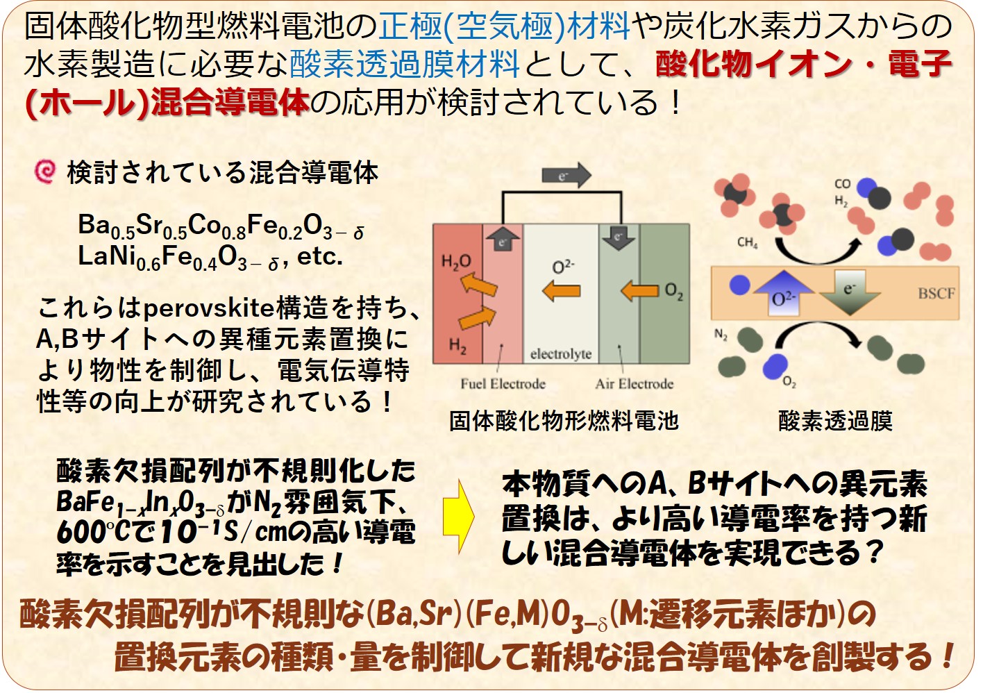 混合導電体は、酸素透過膜材料や固体酸化物形燃料電池の正極材料などに応用が検討されています。 その中でも金属-酸素八面体が各頂点で共有した構造を基本とするペロブスカイト型構造を有する酸化物(ABO3)は、 A, Bの両サイトに異なる元素の部分的な置換が可能です。これにより物性を大きく変えることが可能であるため、 現在、様々な系について検討がなされています。この研究では、我々が見出した酸素欠損の配列が不規則なペロブスカイト 構造を持つBaFe1−xInxO3−dをベースとして、様々な元素を置換して新たな混合導電体の合成に挑戦しています。