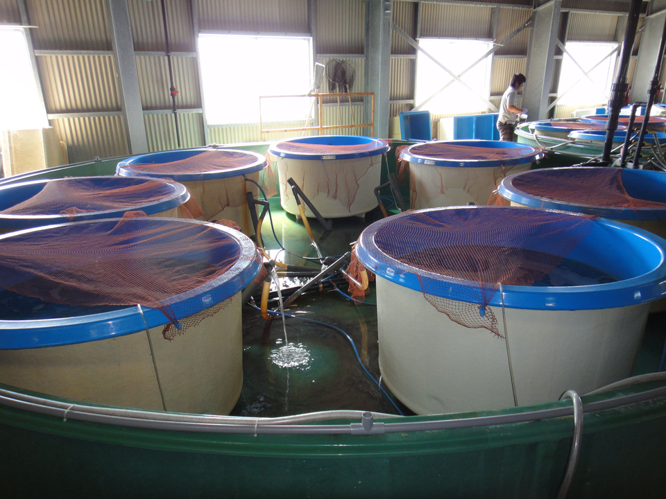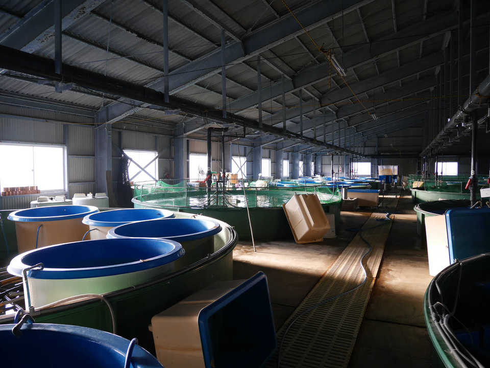 大きな水槽は直径6mで、30トンの収容量になります。この水槽が18基あります。
