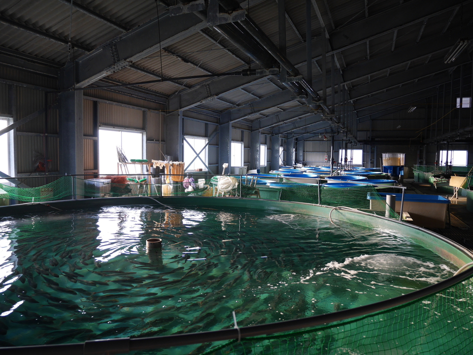 写真手前の水槽で泳ぐ魚は600 g程度のブリです。300匹ぐらいの魚が泳いでいます。だいたい3kgまでは大きくできます。