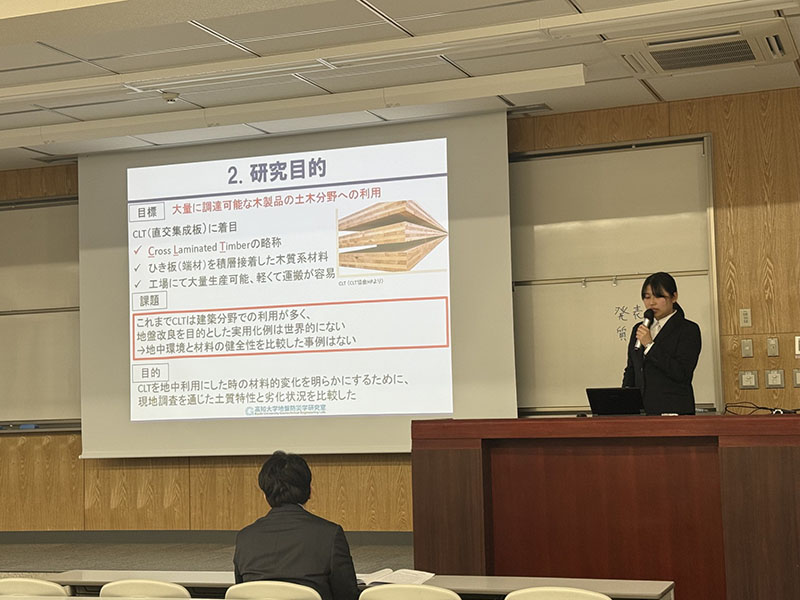 2/9、卒業研究発表会が行われました。地球環境防災学科の先生方・学生が一堂に会する会場での発表のため、いつもの授業とは異なる緊張感が漂う1日でした。それぞれの発表に個性があり、