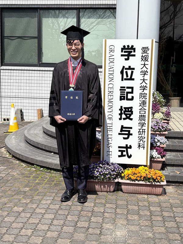 D3の棚谷です。3月17日に愛媛大学大学院連合農学研究科において令和7年度の学位記授与式が開催され、博士(農学)の学位をいただきました。