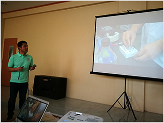 まず,Maria Oronanタバコキャンパス長が開会の挨拶をされました。タバコキャンパスだけでなくメインキャンパスのあるレガスピや農学部のあるギノバタンキャンパスからも関連するスタッフが参加するとともに,食品加工学科の学生も聴講していました。まだ,実験機器がすべて揃ったわけではないので,日本で実験の様子を動画に撮影して,それを上映しながら説明するとともに,実験の原理についてもホワイトボードを利用して解説しました。