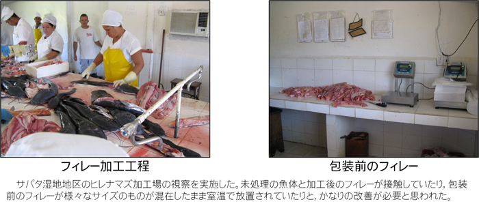 サパタ湿地地区の観光客向けレストランでは,ヒレナマズのフィレーステーキが提供されていましたが, 料理の質の改善の余地が多いと思われました。ヒレナマズ加工場での処理では衛生面や作業動線等で, さまざまな問題が見出されました。おいしい製品を作るためには原材料の品質を高めることが不可欠ですので, その基本的手法である清水馴致の重要性について認識が高まったようです。