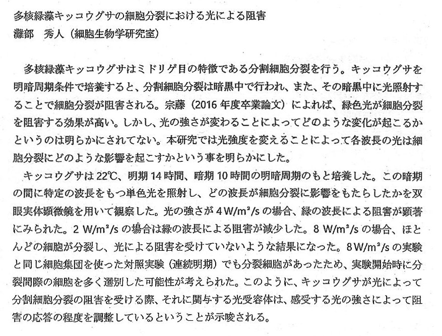 | 灘部 秀人 | 多核緑藻キッコウグサの細胞分裂における光による阻害 |